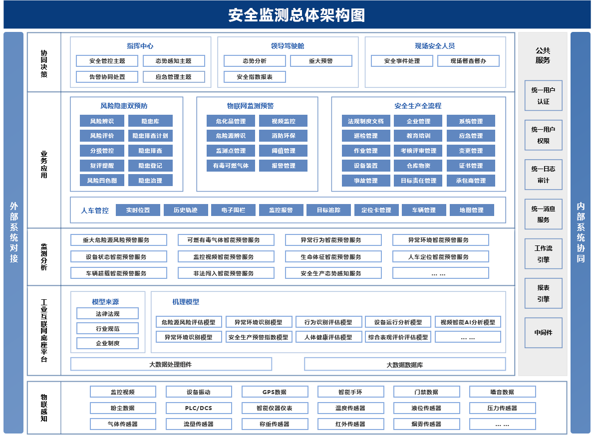 安全监测运维平台,围绕“安全生产标准化管理”体系建设,构建“风险分级管控与隐患排查治理双重预防体系、重大危险源监测预警、法律法规制度管理、特殊作业管理、设备管理、巡检管理、 教育培训管理、承包商管理、应急管理”等功能,全面覆盖工业企业安全生产相关业务。