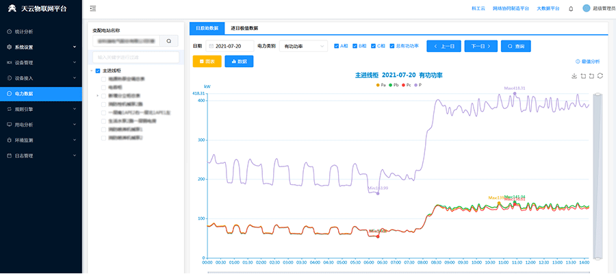 在配電一次圖中,可直接查看該回路詳細(xì)電參量,包括三相電流、三相電壓、三相總有功功率、總無功功率、總功率因數(shù)、正向有功電能,并可以查看24小時(shí)相電流趨勢(shì)曲線