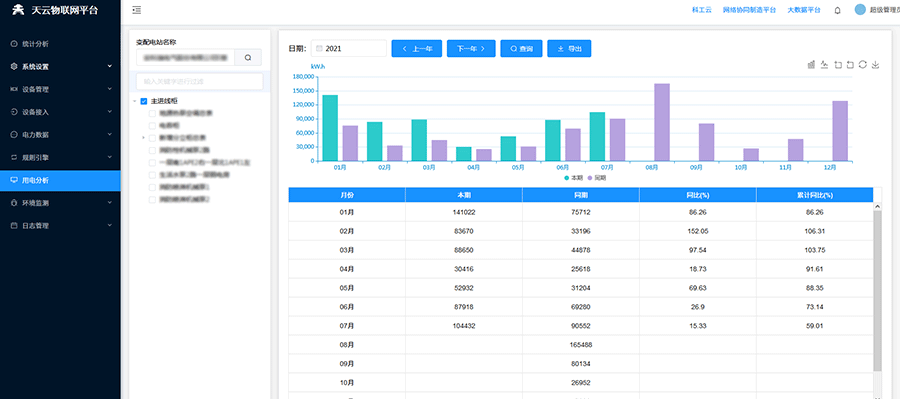 對(duì)被監(jiān)控設(shè)備的用電情況進(jìn)行統(tǒng)計(jì)分析,并可按不同的時(shí)間段進(jìn)行同比和環(huán)比數(shù)據(jù)分析