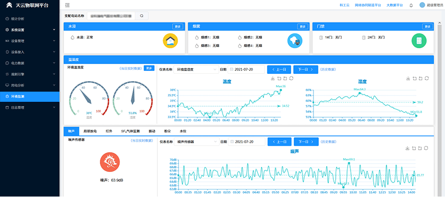 實(shí)時(shí)展示變電所多項(xiàng)環(huán)境參數(shù),比如:水浸情況,煙霧狀態(tài)、門禁狀態(tài)以及溫濕度等基本參數(shù),另外還可針具客戶的需求增加噪聲、局部放電、紅外、SF6氣體監(jiān)測(cè)、粉塵等監(jiān)測(cè)。當(dāng)監(jiān)測(cè)數(shù)據(jù)超限立即啟動(dòng)報(bào)警系統(tǒng),防止異常情況發(fā)生。